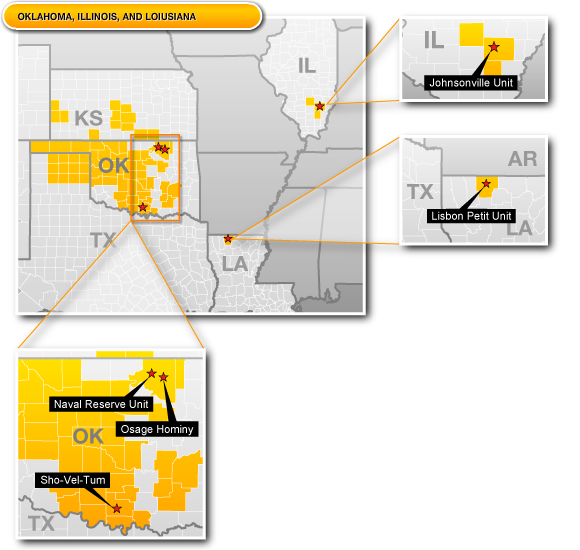 The Company has a number of shallow, primarily oil (80 percent by reserves) properties in southern and northeastern Oklahoma, as well as portions of Louisiana and Illinois. These include several waterfloods, most notably the Naval Reserve and Osage Hominy Units in Osage County, Oklahoma. These low-decline rate-properties have provided a significant number of opportunities to increase production through low-risk, capital-efficient optimization projects across the operating area.