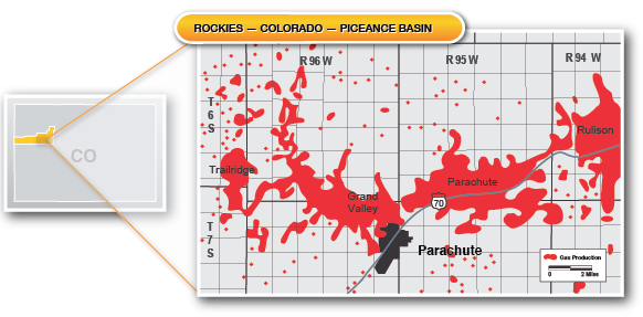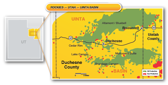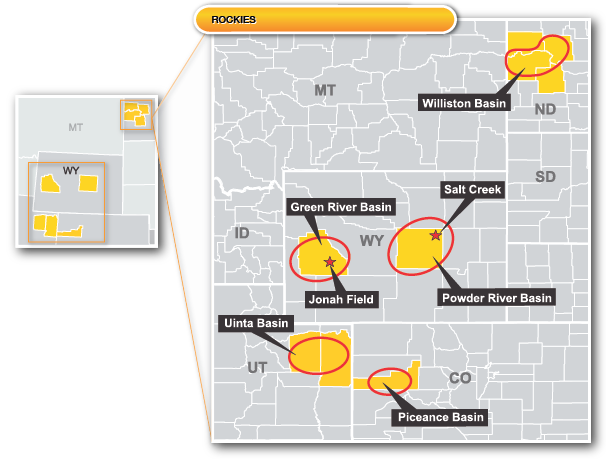 Wells in this diverse region produce both oil and natural gas from formations at depths ranging from 1,000 to over 13,000 feet. The Jonah Field located in the Green River Basin of southwest Wyoming produces from the Lance and Mesaverde formations at depths ranging from 8,000 to 13,500 feet. The Company’s properties in the Powder River Basin consist of a CO2 flood operated by Anadarko Petroleum Corporation in the Salt Creek Field. Properties, recently acquired from Berry Petroleum, produce from the Green River and Wasatch formations in the Uinta Basin at depths ranging from 5,000 to 7,500 feet, and from the Williams Fork formation in the Piceance Basin at depths ranging from 7,500 to 9,500 feet. The Company’s non-operated properties in the Williston Basin produce at depths ranging from 9,000 to 12,000 feet.